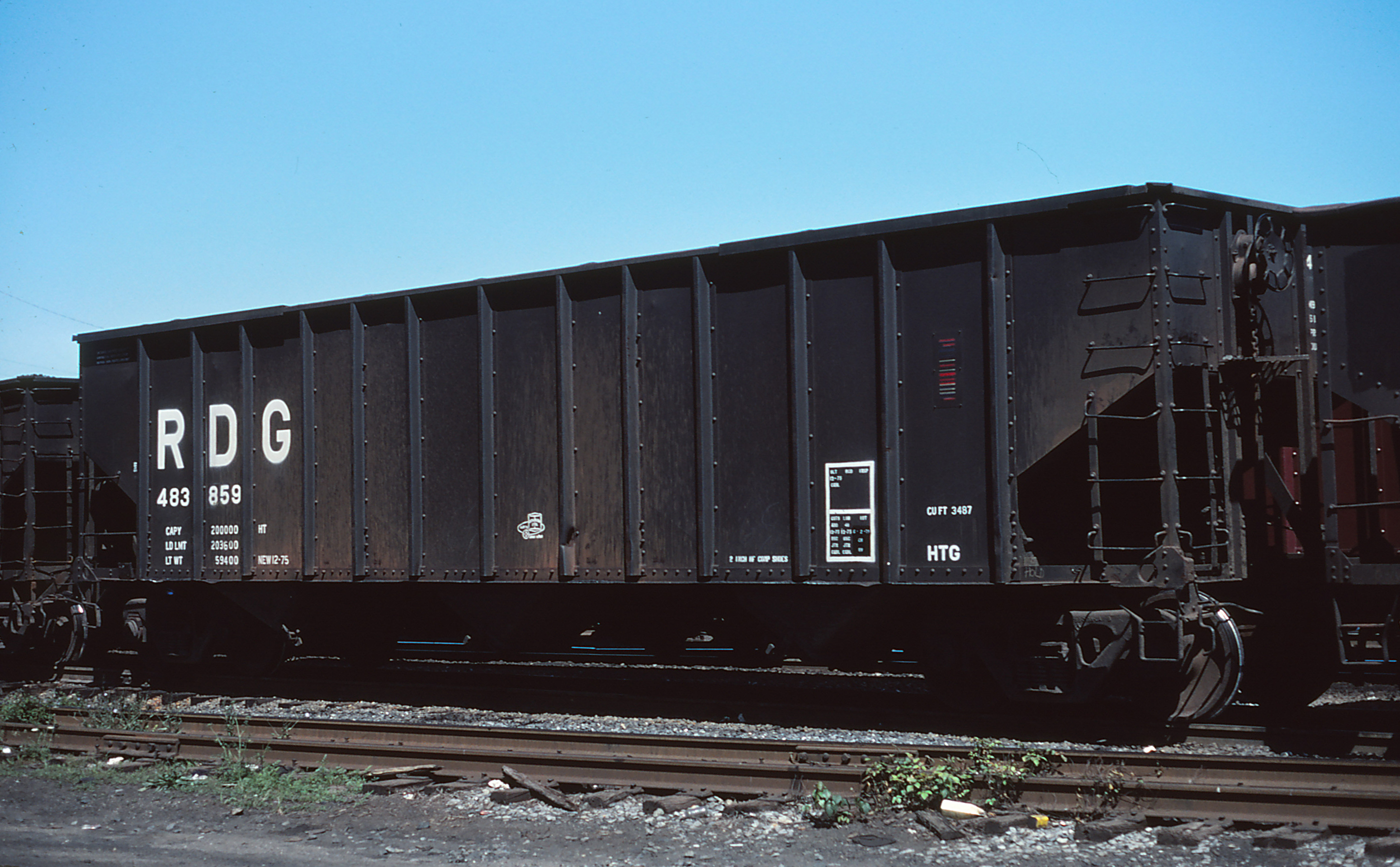 RDG 483859 is seen at an unknown location in July of 1979. Car was built 12-75 by Bethlehem Steel and was later renumbered to CR 480609. It was deleted on 8/4/00 and became NYC 480609 which was deleted by CSX on 8/20/03.