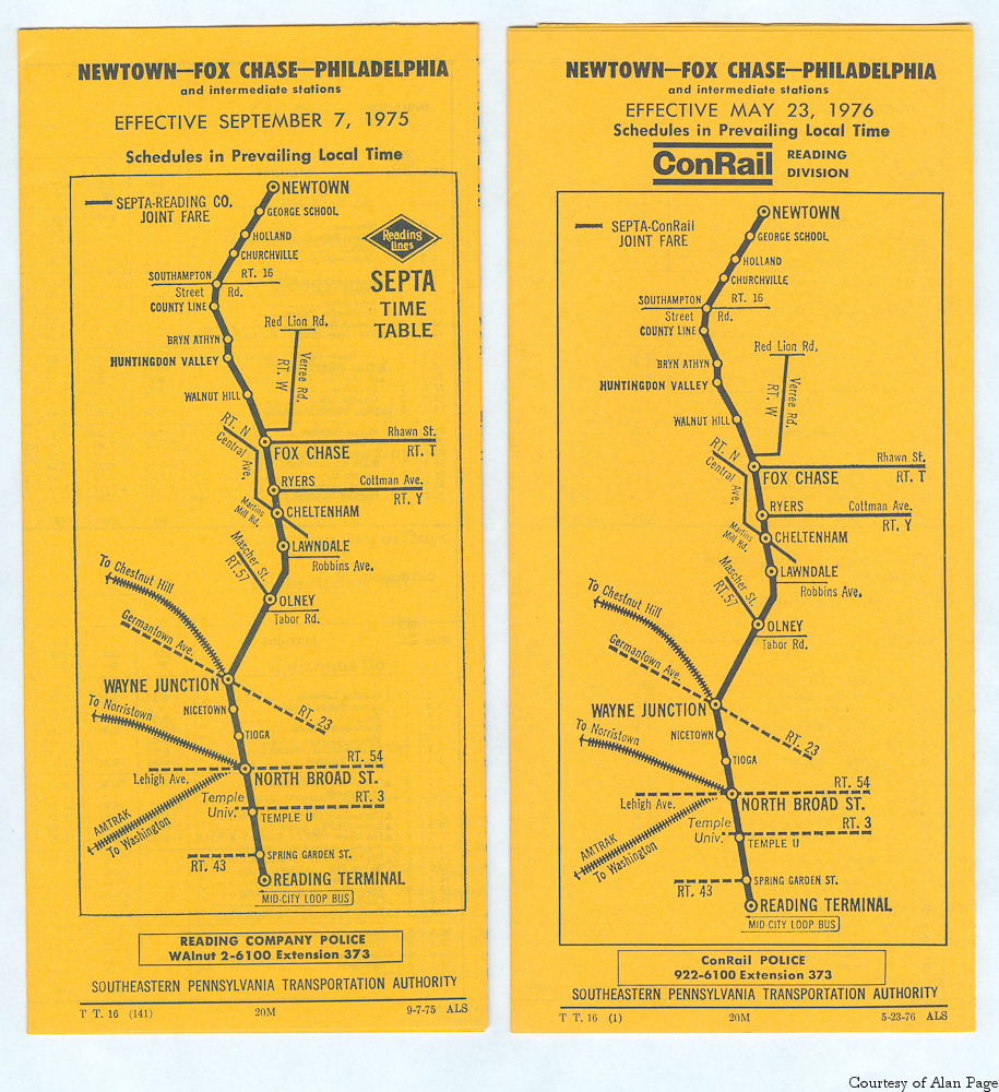 During Septa's Reading Division transition to Conrail-contracted operations in April, 1976, the "Newtown to Philadelphia" May 23, 1976 timetable shows the Reading Lines diamond replaced with the new "ConRail" logo, with lines above and below.