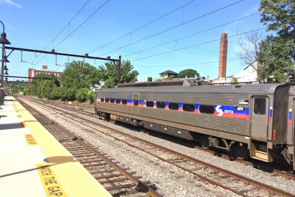 Surviving Commuter passenger service Silverliner IV pairs 127 and 128 lead a group of five MU's, with 404 at the tail end, as they roll through Morrisville on the NEC on August 25, 2014.