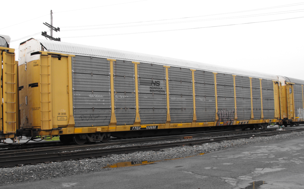 TTGX 158686 is seen in NS paint on Q216-27 at Elsmere DE on 6/29/12. Rack is a former CR ML2G class rack, and was rebuilt, repainted and renumbered CR 26105 in 12-03. Rack number should be NS 26105.