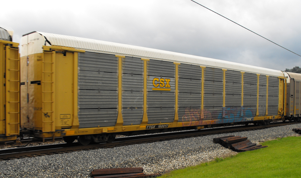 TTGX 160017 is seen in CSX paint is seen in CSX Q276-27 at Cumberland MD on 6/27/13. Rack number is CR 8595, built 6-90 and was rebuilt and repainted CSX 3-07.