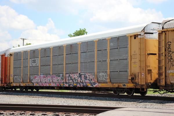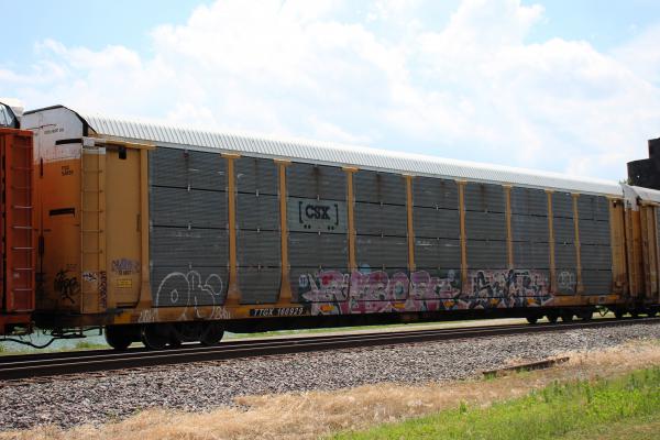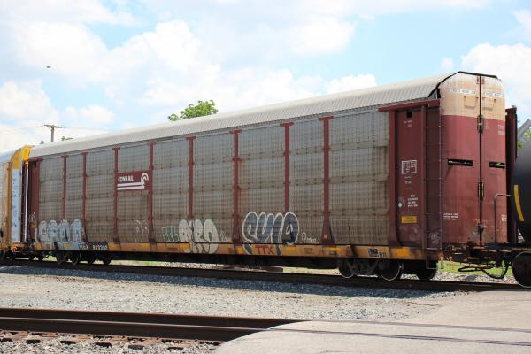 TTGX 253920 is seen in the consist of CSX Q216-01 at Newark, DE on 4/3/15. Rack number is CR 1461, built 5-86, rebuilt and repainted NS 7-03. Rack is still classed ML2E by NS.
