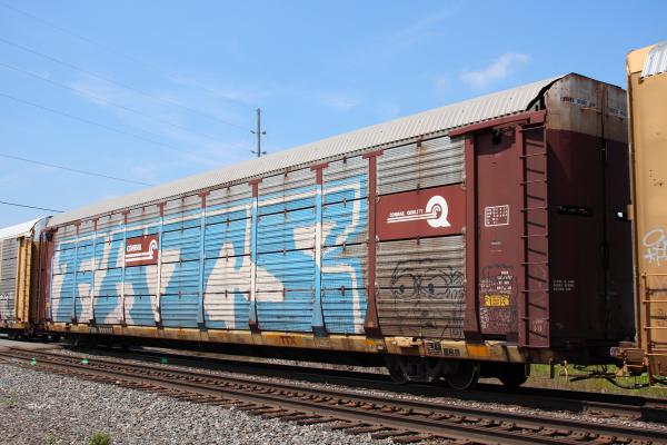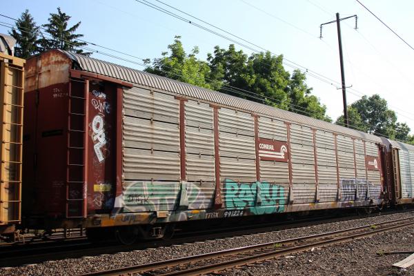 TTGX 253920 is seen in the consist of CSX Q216-01 at Newark, DE on 4/3/15. Rack number is CR 1461, built 5-86, rebuilt and repainted NS 7-03. Rack is still classed ML2E by NS.