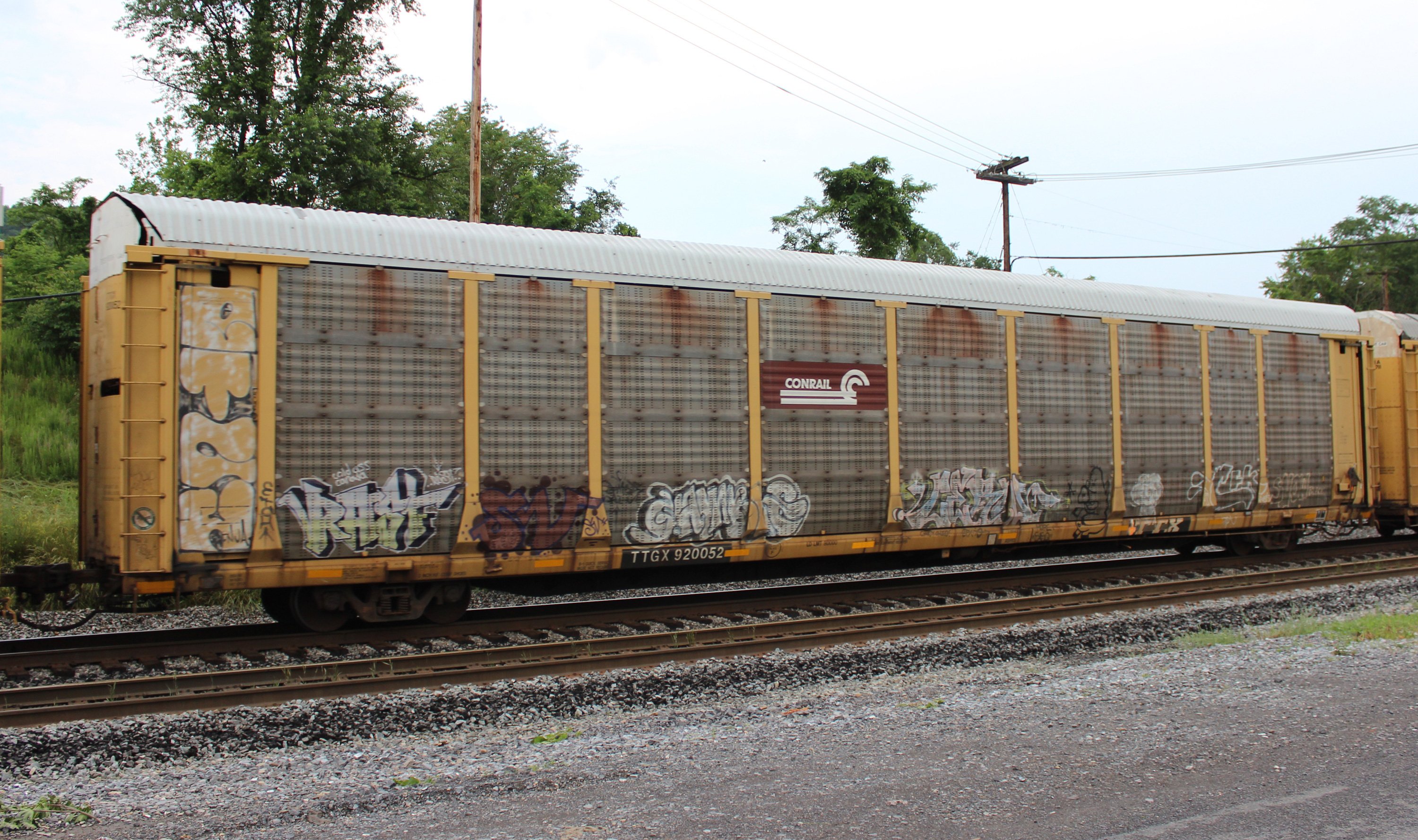 TTGX 920052 is seen in the consist of CSX Q235-14 at North Branch, MD on 6/14/17. Rack number is CR 8423, built 6-90, rebuilt 2-98 and is now owned by NS.