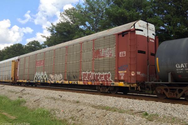 TTGX 974239 (built 6-73, rebuilt 8-97) with class ML2L rack CR 10945 (Thrall Job 97-0416).