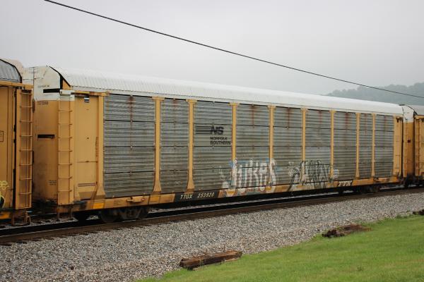 TTGX 974459 is seen in the consist of CSX Q216-01 at Newark, DE on 4/3/15. Rack number is CR 10289, built 12-94 and is now owned by NS.