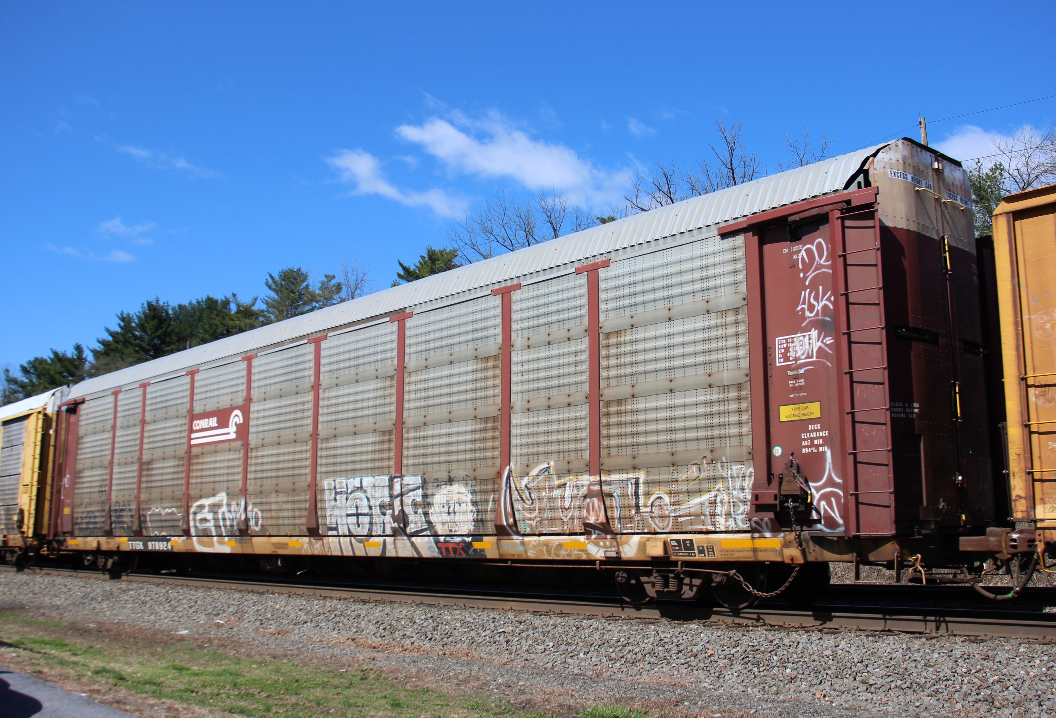 TTGX 978924 is seen in the consist of NS 16T at Wyomissing, PA on 4/2/21. Rack number is CR 10900, built 9-97 and is now owned by CSX.
