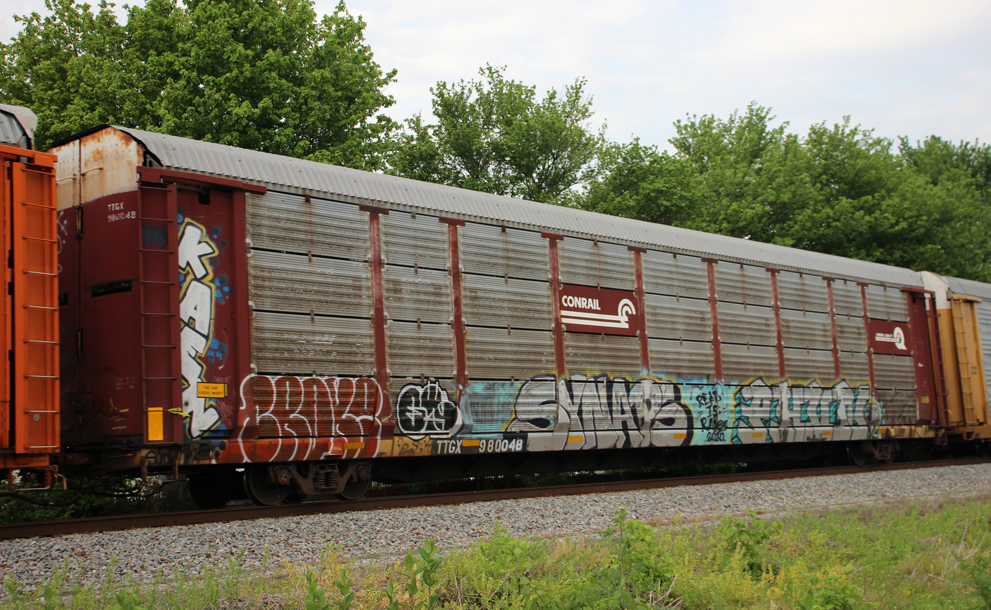 TTGX 980048 is seen in the consist of CSX Q217-20 at Newark, DE on 5/20/22. Rack number is CR 9766, built 10-93 and is now owned by CSX.