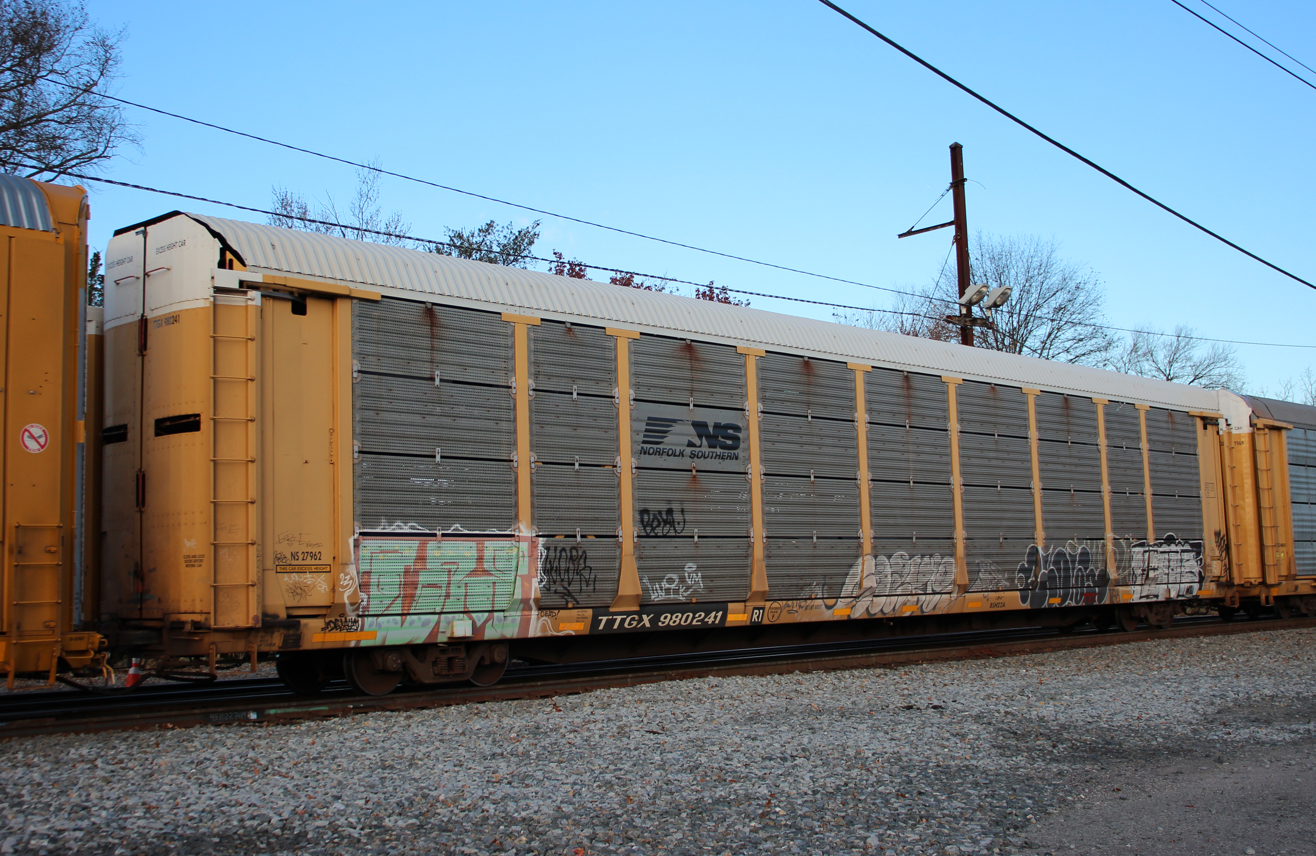 TTGX 980241 is seen in the consist of NS 36A at Perryville, MD on 11/16/25. Rack was built as CR 9634, a CR ML2L class rack, in 3-93. It was then rebuilt, repainted and renumbered to NS 27962 by TRA-L 11-13. Rack is now class FB552 by NS.