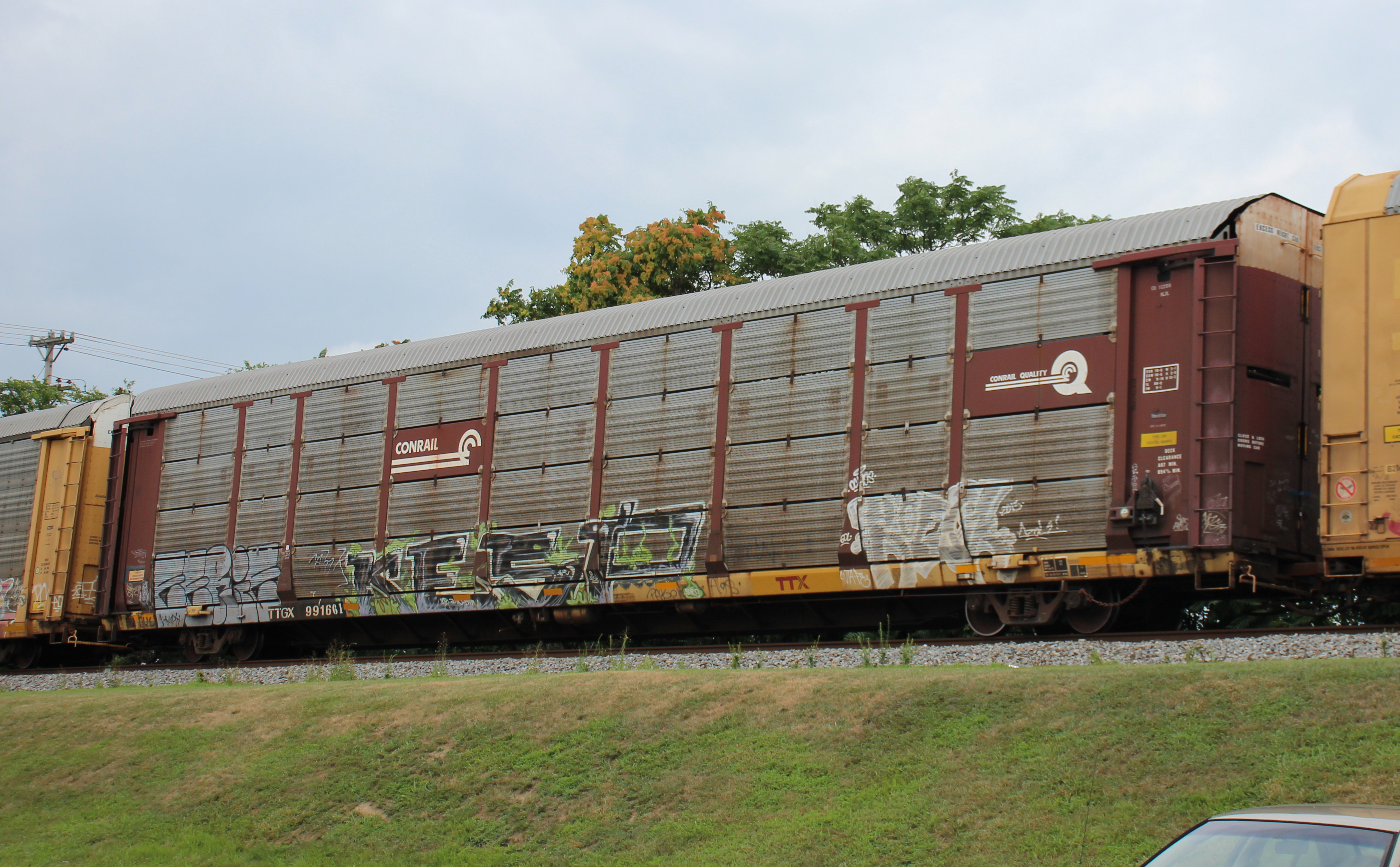 TTGX 991661 is seen in the consist of CSX Q216-29 at Newark, DE on 8/1/21. Rack number is CR 10208, built 9-94 and is now owned by CSX.