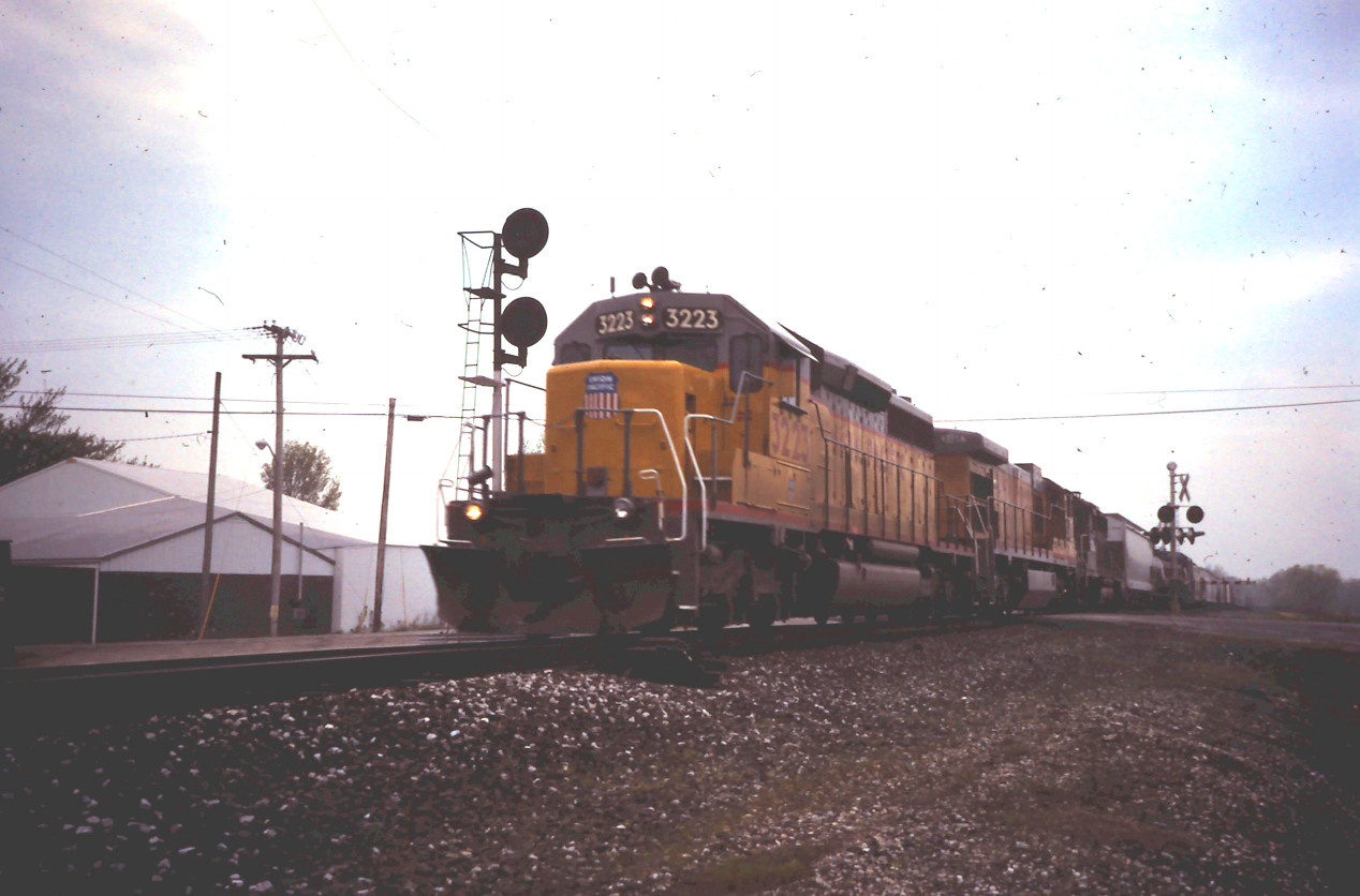 UP 3223 and friends leads NLPI-5 at Marshall, IL on a rainy day April 25, 1998