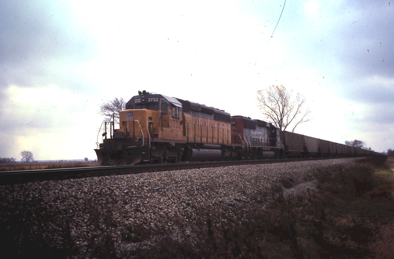 UP 3732 and a SP GP60 are on the point of a parked UNW-467 empty coal train at Schneider, IN on October, 27, 1996. This train, which used NORX cars, was on its way back from the Nipsco power plant in Wheatfield, IN before being handed off to the UP at Chicago.