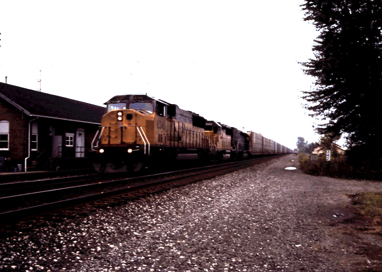 UP 6346, 5553, and a SP EMD leads NPSE-2 at Bryan, OH on August 22, 1998