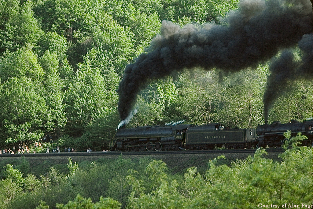 Former Reading T-1 4-8-4 #2102 and GTW 2-8-2 #4070 are working hard as they continue to climb Horseshoe Curve on their way back to Pittsburgh on May 22, 1977. All manner of steam railfans were gathered around the massive Curve to capture a glimpse of the powerful 4-8-4 and her 2-8-2 helper, and neither steamer disappointed.