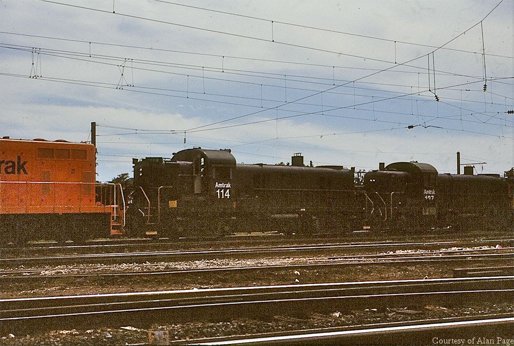 Amtrak RS-3's 114 and 127 coupled to MOW unit 15152 rest at Morrisville in July, 1978.