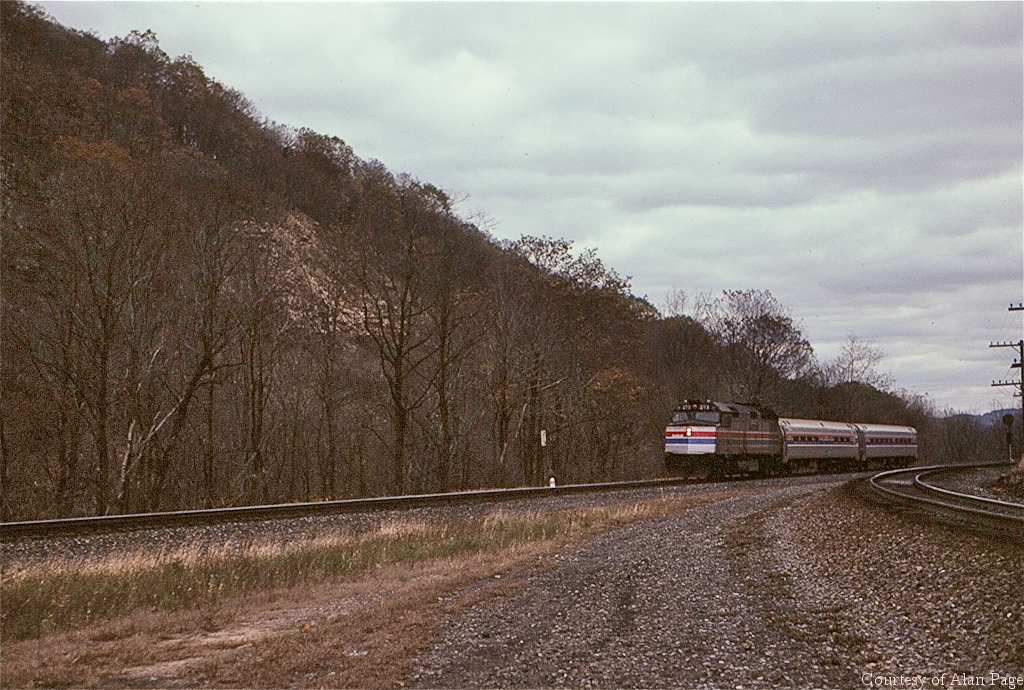 Amtrak F40PH 273 roars through Spruce Creek, PA in November, 1980.