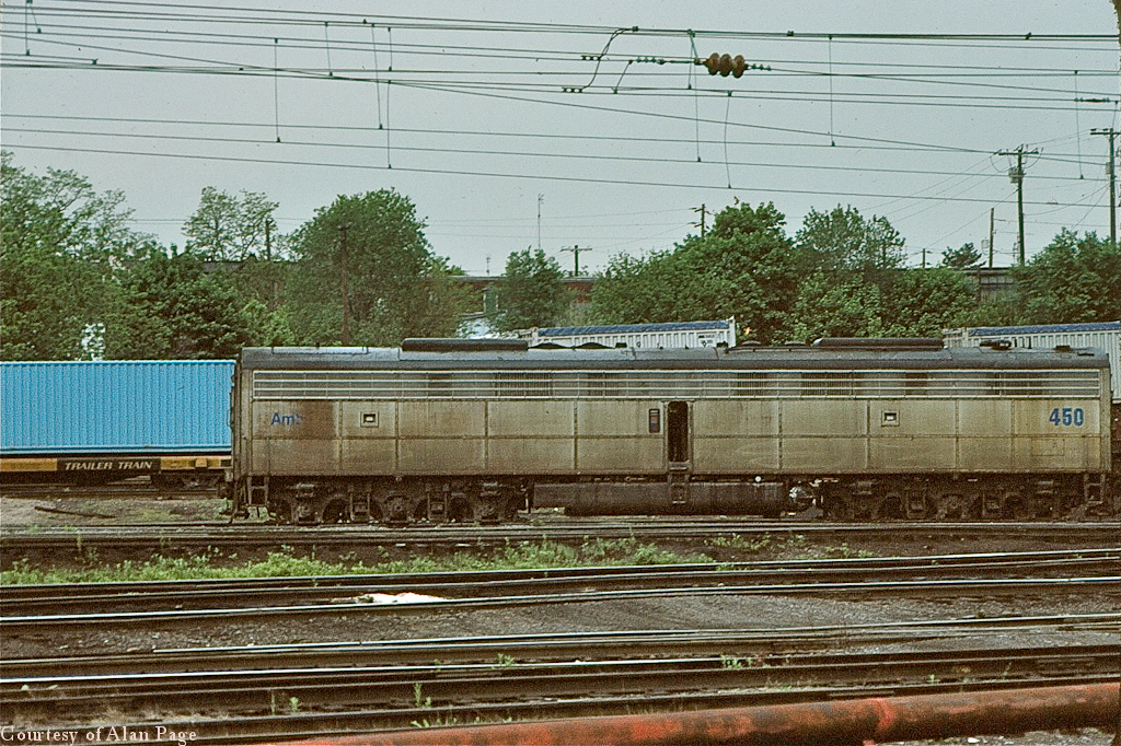 With a CR container train passing behind, Amtrak E9B 450 (ex-MILW 32B) rests at Harrisburg in May, 1977.