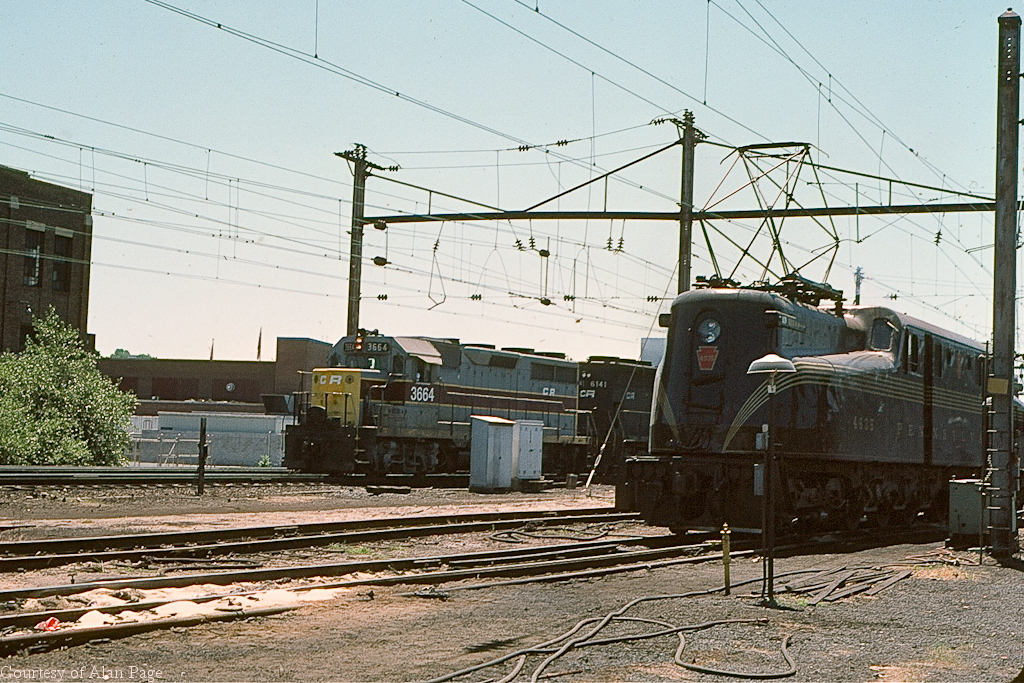 Amtrak GG-1 4935, a month after her restored debut in original PRR Brunswick green and pinstripes, rests at the Harrisburg engine terminal as CR GP35 3664 and SD45 6141 roll past in June, 1977.