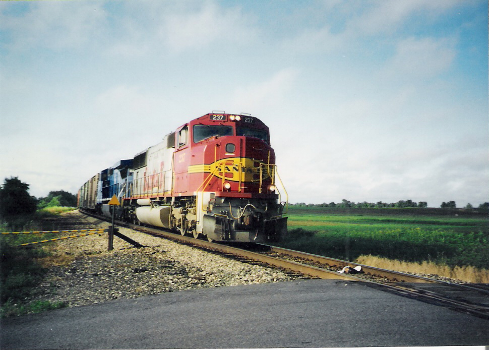 ATSF 237 and a LMS GE leads train SFEL west of Lowell, IN on July 30, 1996