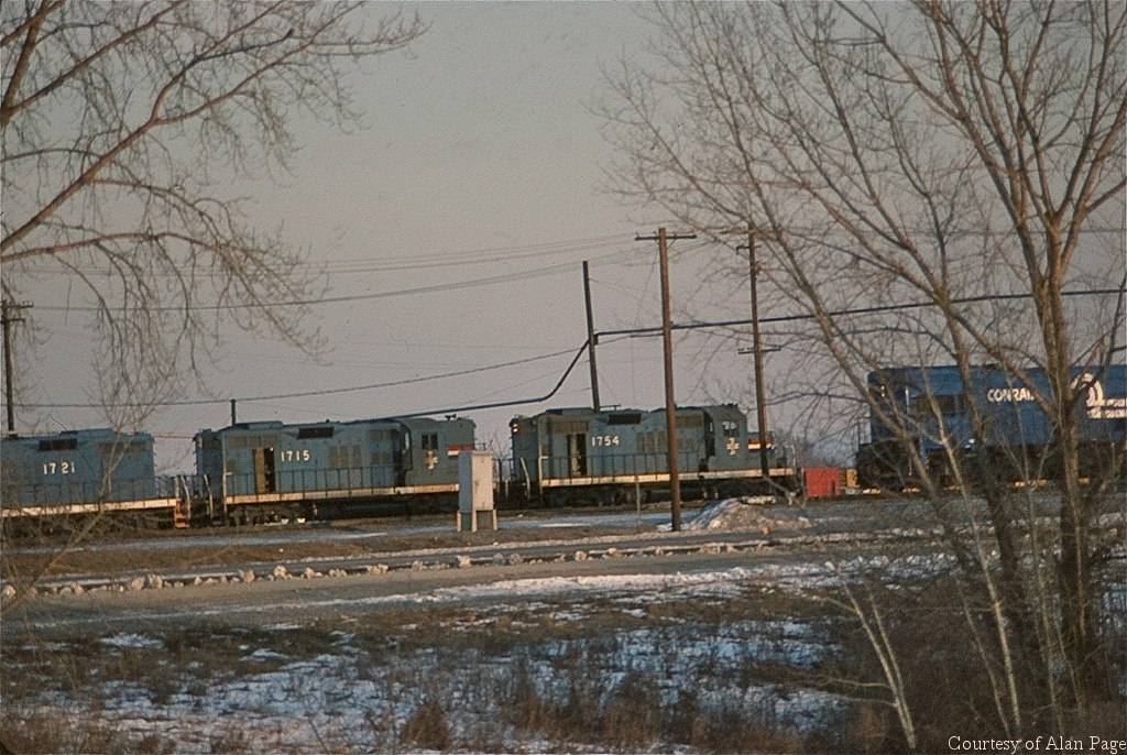 A trio of Boston & Maine units, GP-18 1754 and GP-9's 1715 and 1721, pass by a home-based CR U-boat at Selkirk yard in December, 1977.