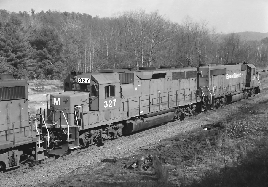B&M 327, ex CR GP40 3139, second out in MERU rounding the big curve in Montague, MA. on Feb. 25, 1984.