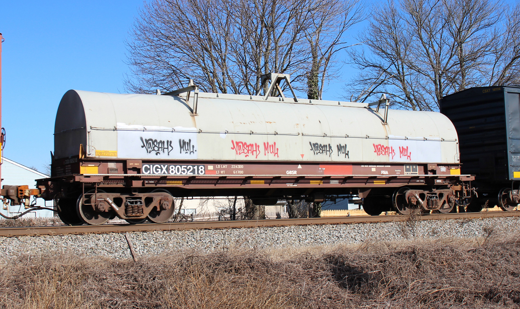 CIGX 805218 is seen in the consist of CSX Q439-25 at Newark, DE on 1/26/20. Car is ex CR 623954 and was built 10-97 by Thrall as part of Job 424.