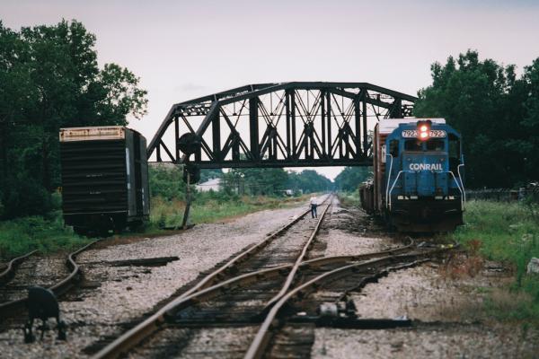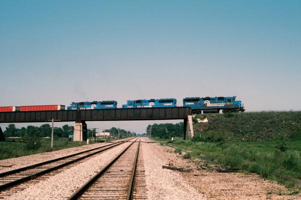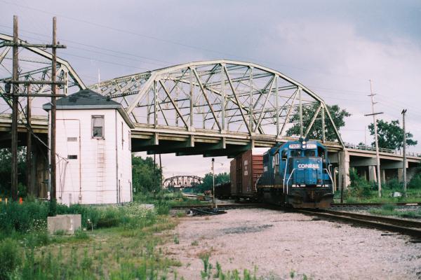 A Conrail local freight led by GP15-1 1667 heads west on the former PRR Panhandle Line at Brighton Park, in October 1998. The caboose was CR 18043. Doug Davidson photo with permission