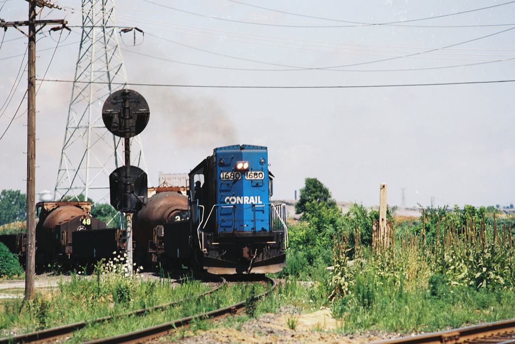 Conrail GP15 No. 1680 comes to life as the Hot Metal Train gets a proceed signal to move off of the River Line and onto the Bernice Cut-off. Doug Davidson photo with permission