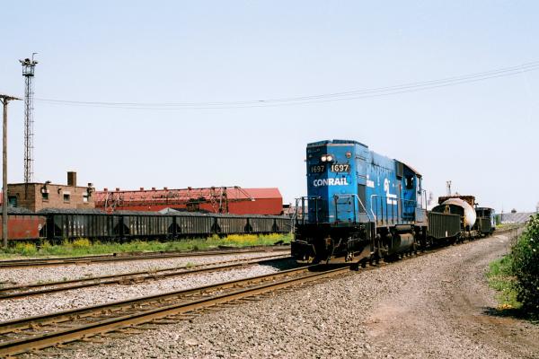 Conrail's hot metal train led by the 1697 heads east on the SC&S Bernice Cut-off between Burnham and Calumet Park in July 1992. Doug Davidson photo with permission