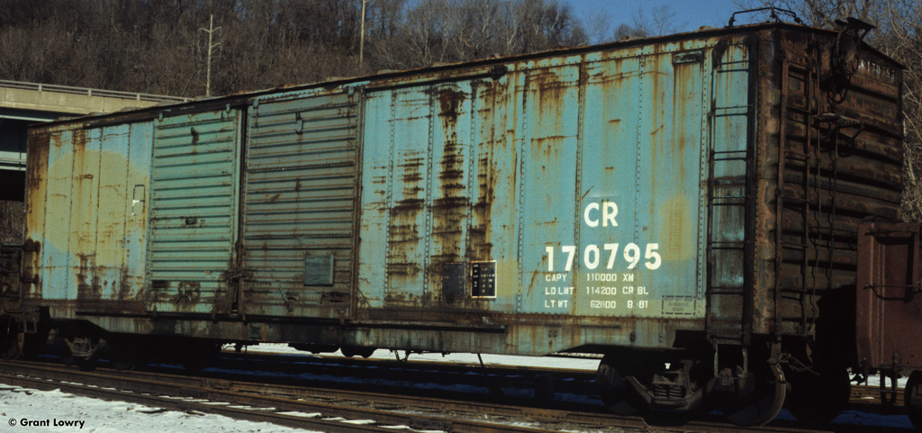 Conrail 170795 is seen at Columbia, PA in the mid 1980s. Gotta love the reporting marks on the wrong end of the car.Car is ex NYC 48317.