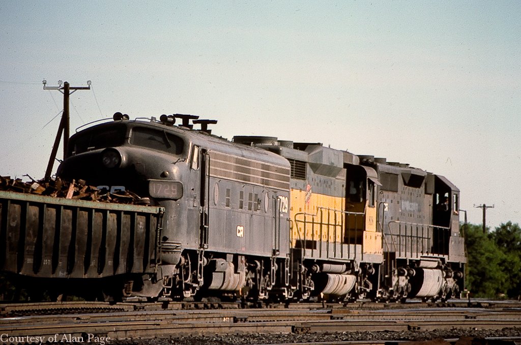 CR SD-35 6038 leads leased CNW GP-30 818 and CR F-7A 1729 into Enola yard in June, 1977.