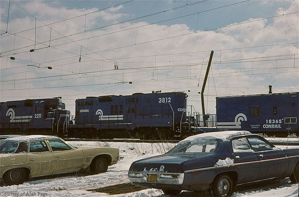 CR GP30 2211, GP-9B 3812, and N9E class caboose 18365 work at Morrisville yard in March, 1978.