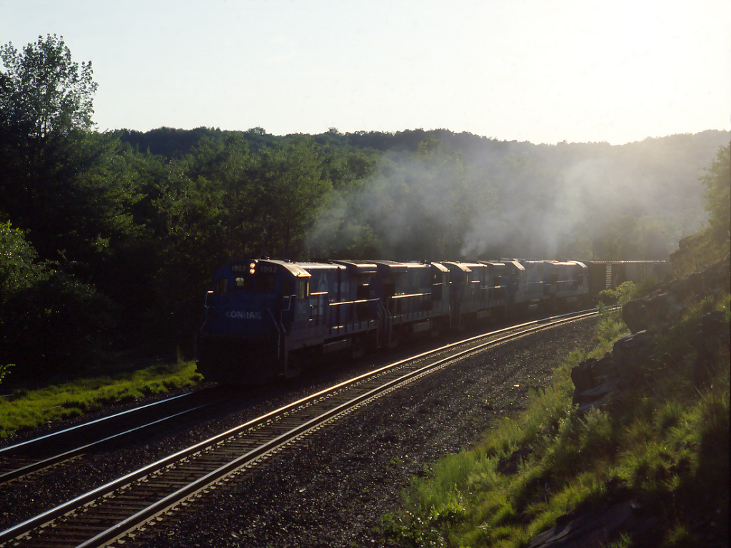 Nearing sunset, eastbound SENH drops down into Bancroft, MA. at 19:00 on the evening of July, 1, 1982. He's the first of three trains which will make a great ending to this day.
