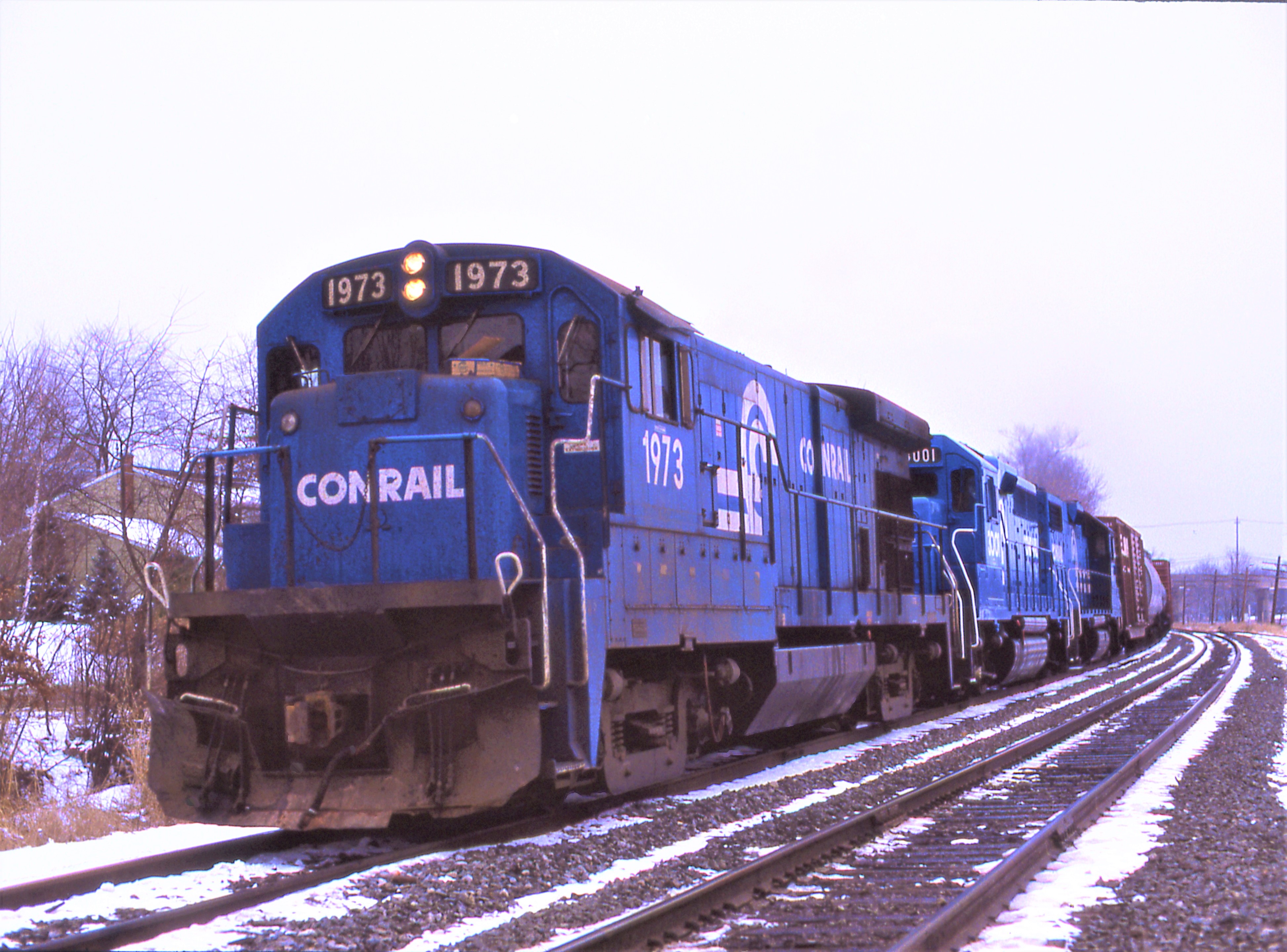 GE B23-7 #1973 & 2 other units with westbound freight at New Market Road, Piscataway, NJ. Feb 21, 1985.  A cold, dreary day!