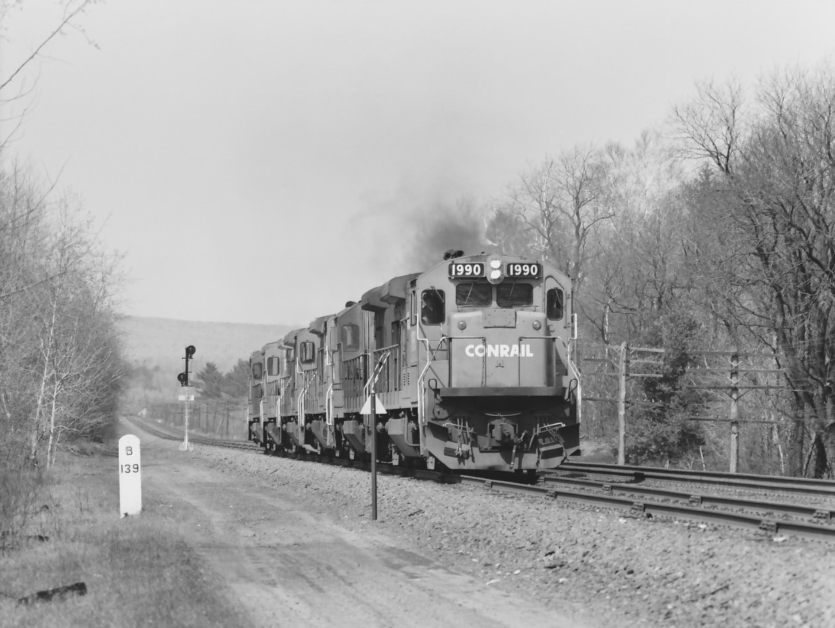 The 1990 leads a solid six unit group of B23-7's as a light engine move eastward past MP 139 in Hinsdale, MA. on April 27, 1983.