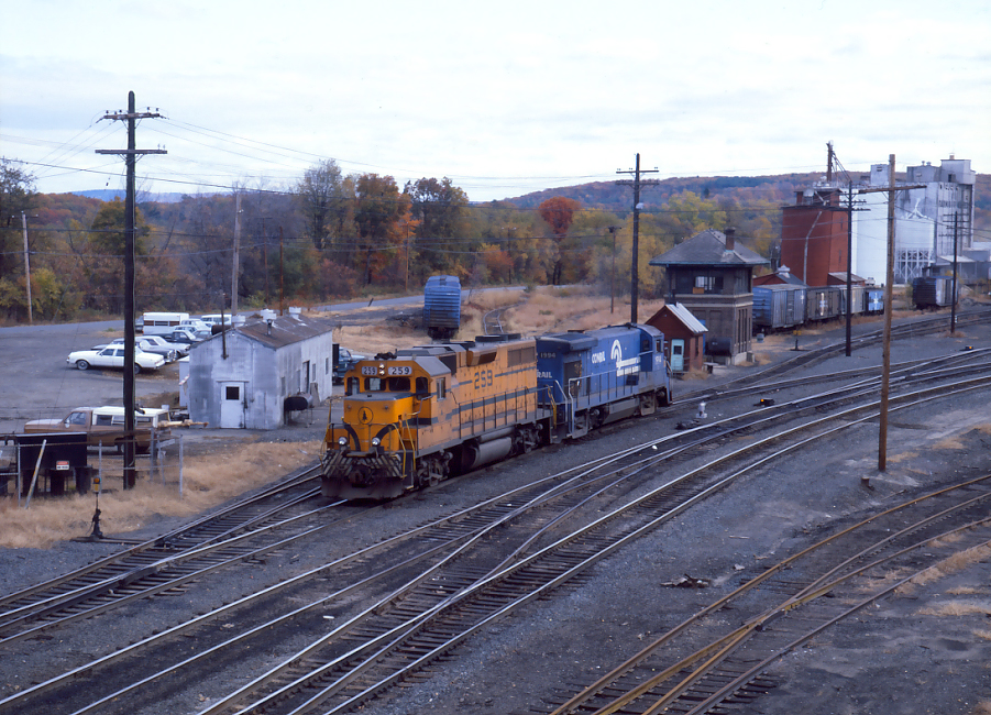 After dropping the two units, MEC 259 and CR 1994 return to their train for the remainder of the trip to Springfield. MAYBE...CR will have their "wanderer" returned, at last. As a bid for ecumenicalism, we have MEC and CR engines powering a B&M train on B&M tracks with.......wait for it..........a D&H caboose bringing up the markers.