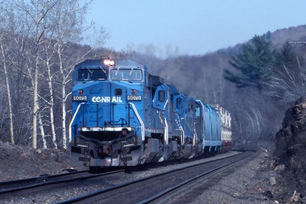 B23-7 2023 leads TV80W near MP 58 in Charlton, MA. on Jan. 22, 1988. The 2023 is the last unit in CR's 124 unit group of B23-7's.