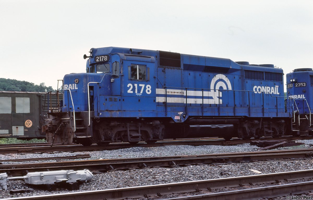 Former PC 2178/PRR 2178 is seen at Rutherford, PA on 6/3/1984. Note the ex-Reading 50' boxcar in the background.