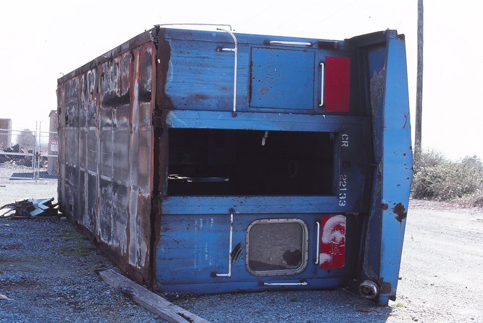 What's left of CR 22133 is seen on it side at Harrington, DE on 3/28/98. Caboose is ex RDG 94106 and was built 8-70.