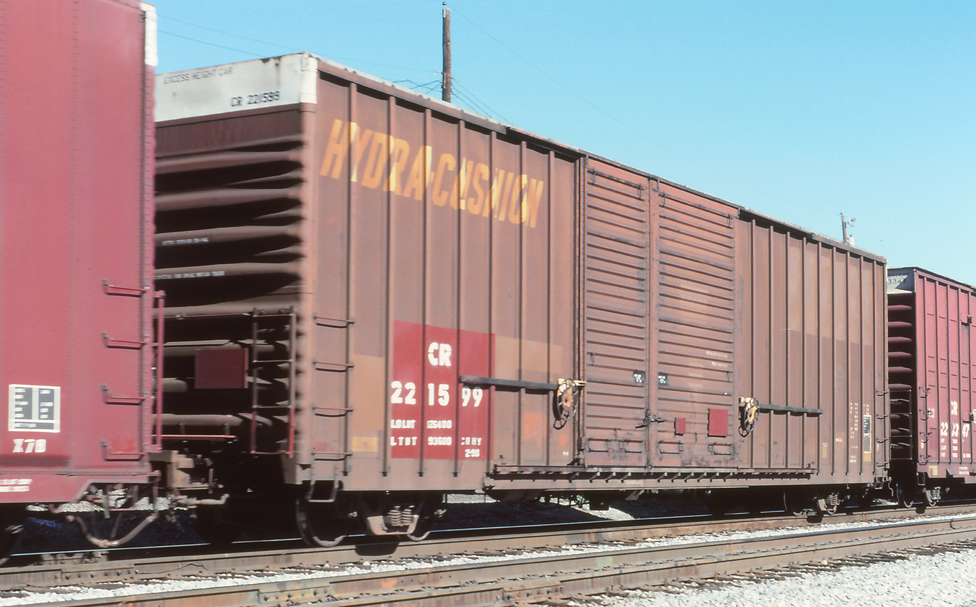 CR 221599 is seen on a westbound at Cumberland, MD, on 10/6/90. Car is ex SSW 63529 and was built 8-73. It later went to CPAA 206624.