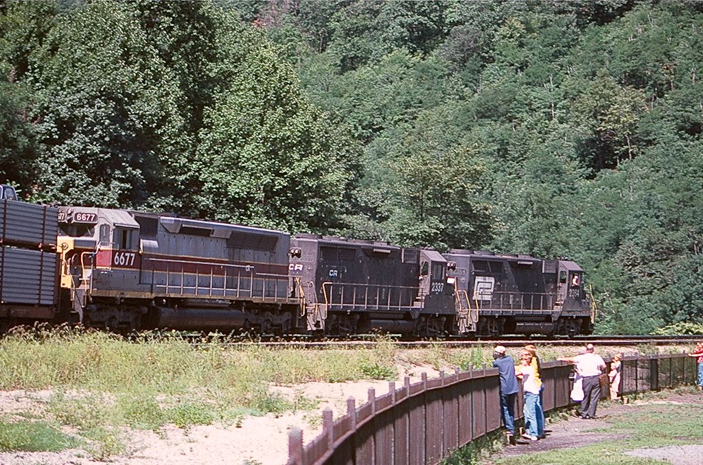 CR SDP45 6677 (ex-EL 3646) trails GP-35's 2364 and 2337 as they brake down the hill at Horseshoe in August, 1977.