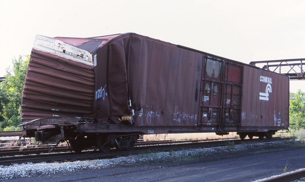 In this view of CR 242004, at Altoona PA on 6/19/02 heavy damage can be seen. Car is ex CR 295135/PC 295135 and was built 10-68 by Greenville Steel Car Co. Car was deleted 1-31-00 and was supposed to go to CSX, but as seen here, the car never made it.