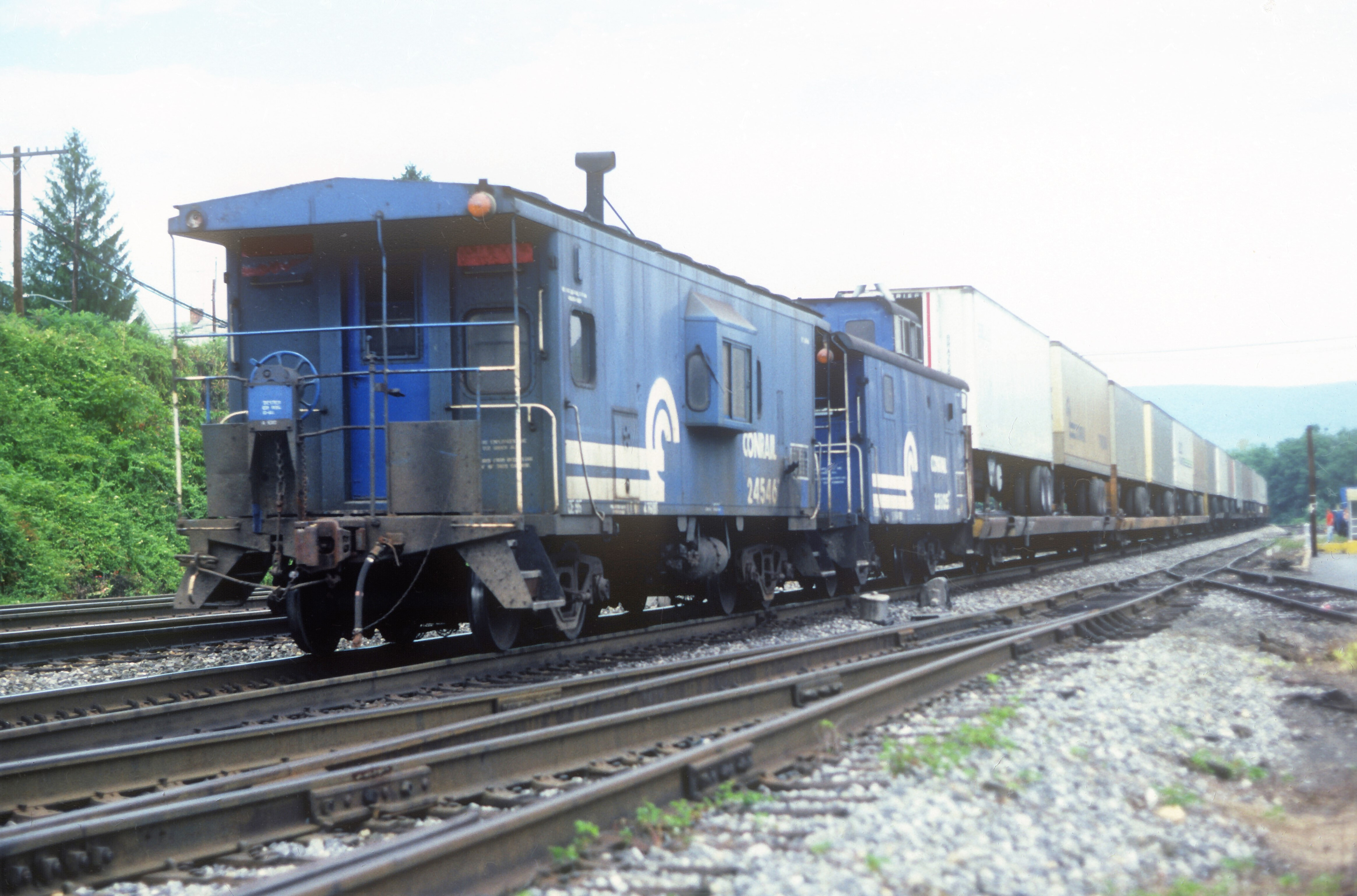 Conrail Cabin Cars 24546 and 23875 bring up the rear of westbound TV-3 at Mifflin, PA