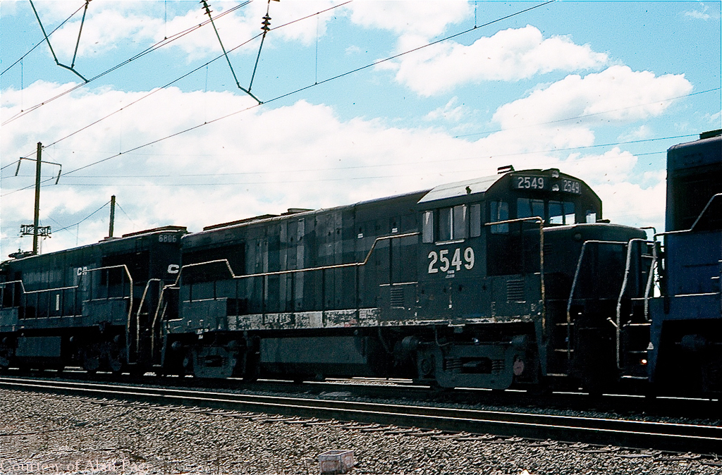Ex-PC U25B 2549 is third in line following GP38-3 8082 and U25C 6806 through Morrisville yard in August, 1979.