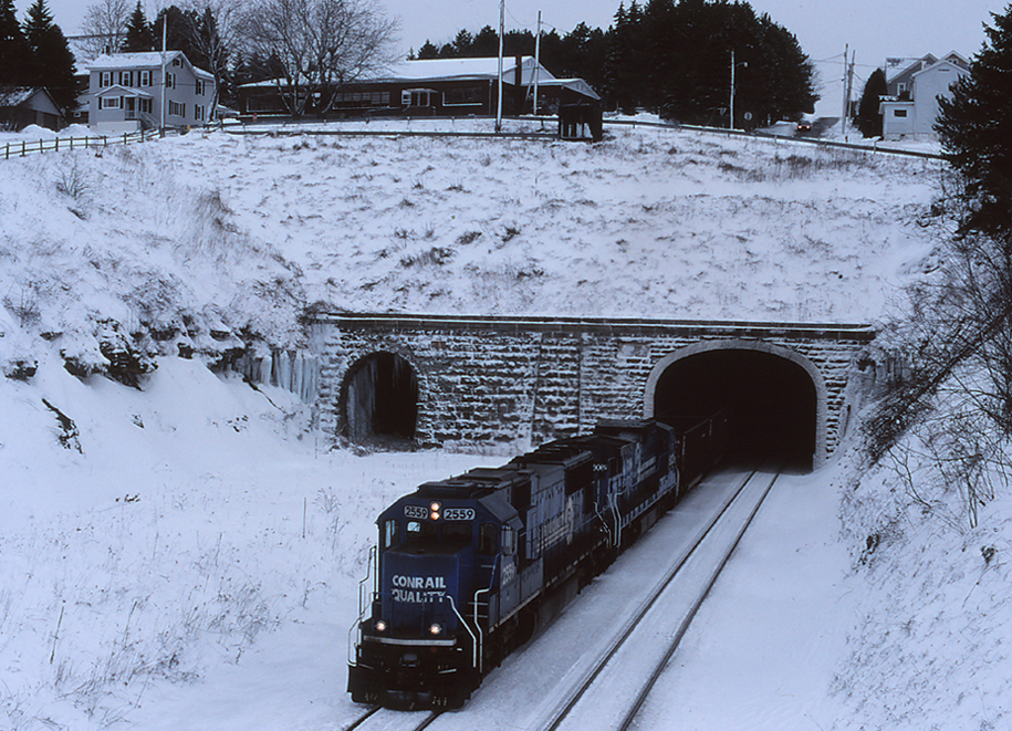 CR 2559 & 6002 are seen leading XSG-400 out of the tunnels at Gallitzin, PA on 3/5/99.