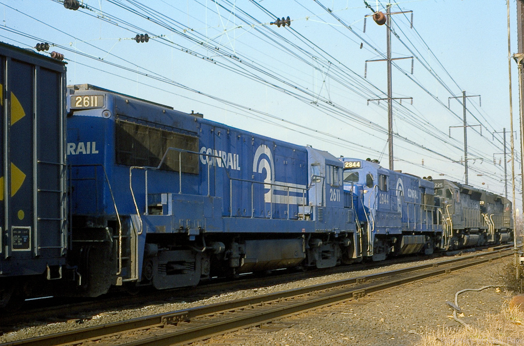 After departing Morrisville yard, CR U25B 2611 runs 4th behind U30B 2844, SD45 6225, and SD40 6329 on the NEC at Morrisville in November, 1979.
