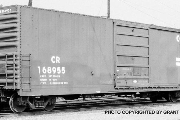 CR 269156 class X72 boxcar photographed at Wall, PA in April 1987. Paint applied by Hollidaysburg Car Shop in March 1980 (CR BL 3-80). Car is being switched by CR 1652, the Thompson shifter (symbol WITH) out of Thompson Yard, Duquesne, PA on the Mon Line.