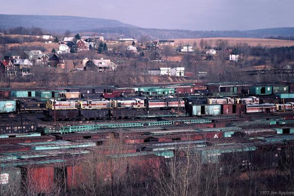 Ex-PC/CR 2771 U23B is one of two U23Bs getting ready to push an empty rail train north on rails still in place through Pine Creek Valley on the Corning Secondary to pull up another load of rail in Conrail's abandoning the line from Wellsboro Junction to Jersey Shore, PA.