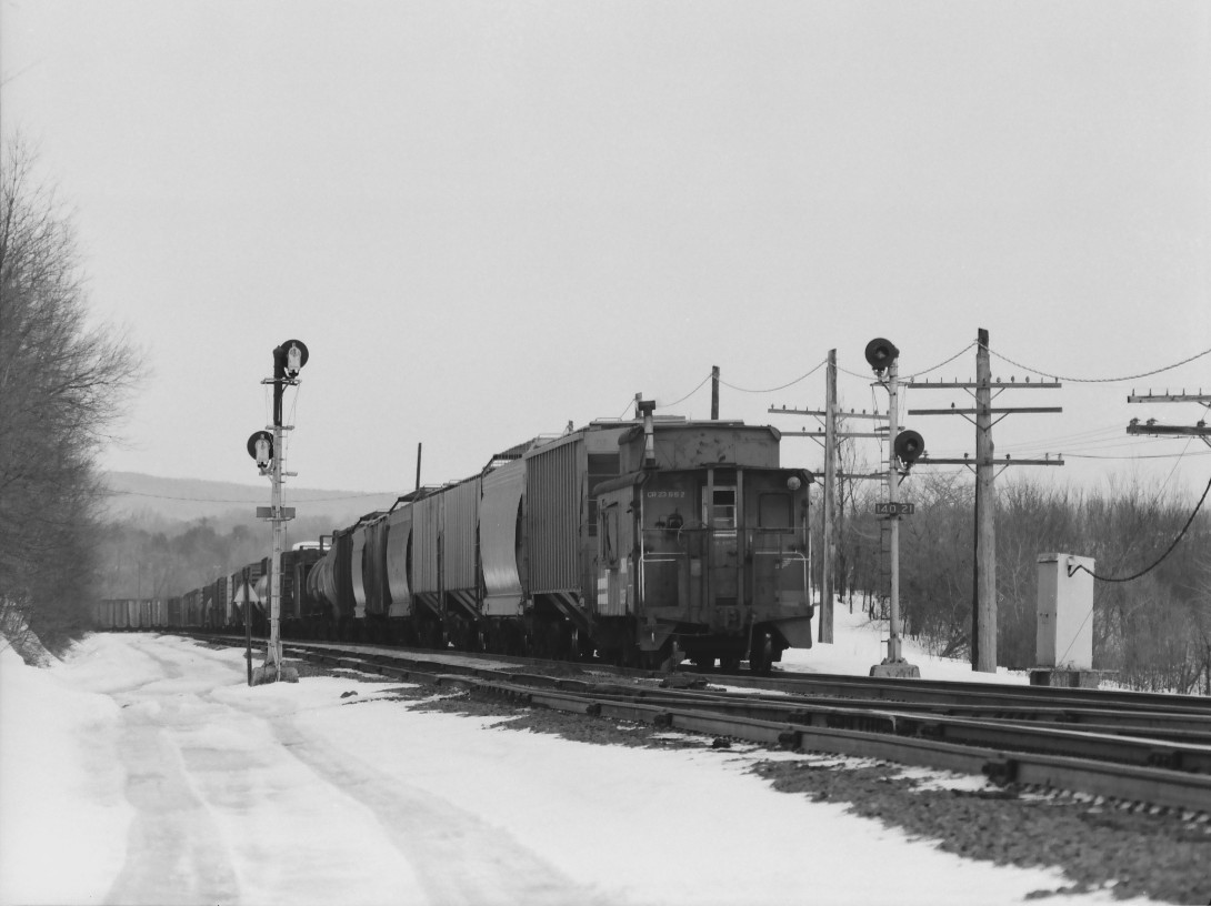 Former New Haven NE-5, CR N8B buggy 23552 on the rear of RESE splits the block signals at the Hinsdale crossovers near MP 140 in Hinsdale, MA. on March 6, 1982.