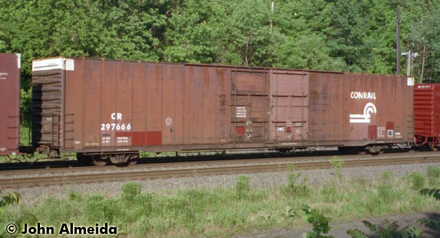 Conrail box car Class B83A CR 297666 May 1996 ORER description: Box, steel, cushion underframe, movable bulkheads, rub rails, Plate F, AAR car type code A836, mechanical designation XL.